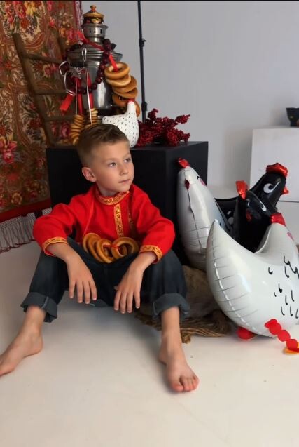 В кадре — очаровательные малыши, которые полностью погрузились в атмосферу. Девочка в алом сарафане и нарядном кокошнике и мальчик в традиционной косоворотке чувствовали себя настоящими героями русских сказок. А вокруг — самые узнаваемые атрибуты: пузатый самовар, связки душистых бубликов, гроздья красной рябины и забавные надувные курочки!